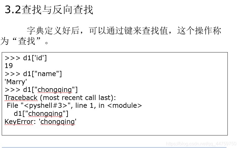 字典是集合不是序列。字典可以看出元素对构成的列表,其中一个元素是键,另一个元素是值。在搜索字典时,首先查找键,当查找到键后就可以直接获取该键对应的值,效率高。