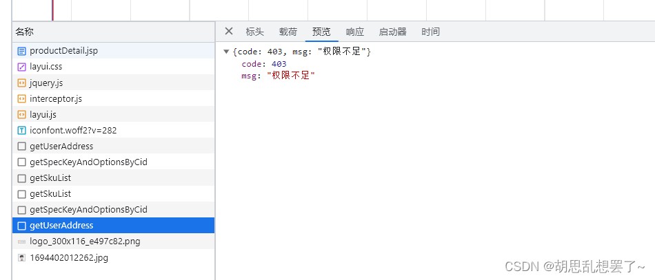 当使用用户1登录后,在前端对该接口进行访问时,后端会返回权限不足的状态码以及相应的信息信息。该接口的方法也不会执行。