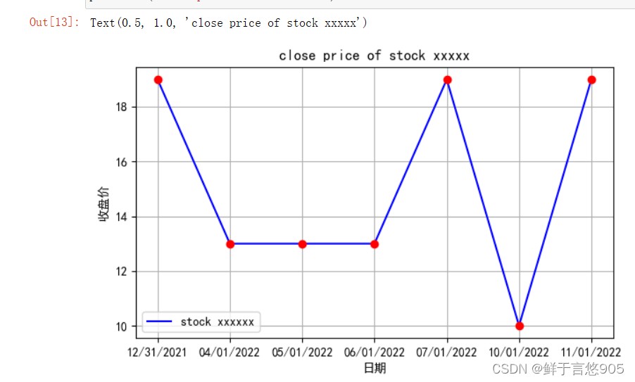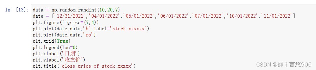 【例7.11】给定某只股票从2021年12月31日到2022年1月11日的收盘价格,请利用python的折线图和散点图组合图形式进行数据的绘制。