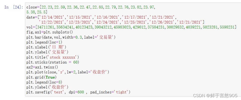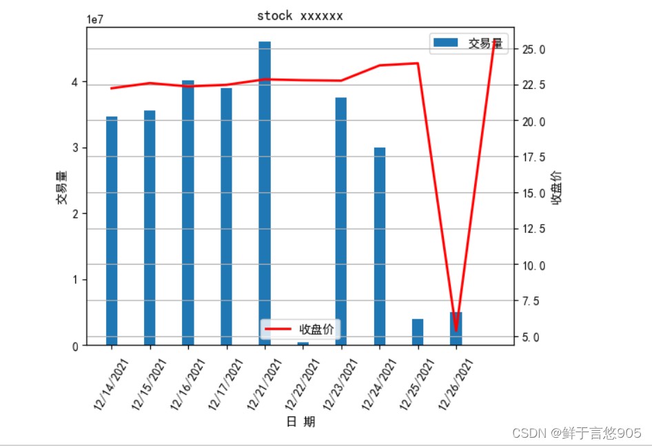 【例7.11】 【例7.12】已知给定的某股票在2021年12月14日至2021年12月28日的收盘价格和交易量,请利用python绘制双坐标轴图,其中左坐标轴反映交易量,以柱状图表示;右坐标轴反映成交价格,以折线图表示。