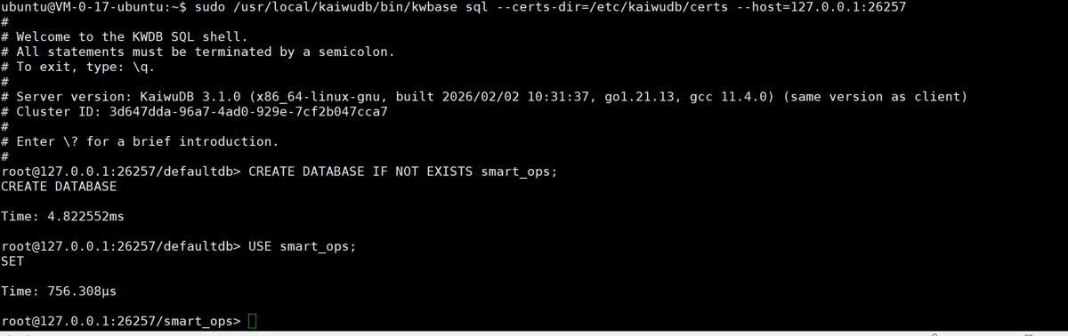 sudo /usr/local/kaiwudb/bin/kwbase sql \ --certs-dir=/etc/kaiwudb/certs \ --host=127.0.0.1:26257
