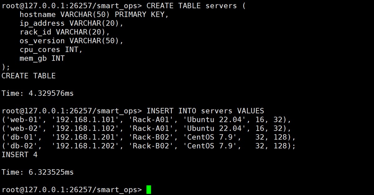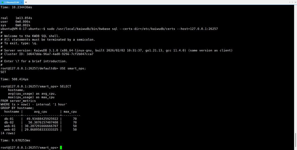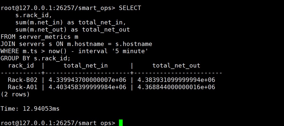 - 业务价值:这是一个典型的跨表聚合查询。kwdb 成功将 metrics 表中的流量数据与 cmdb 表中的机架信息(