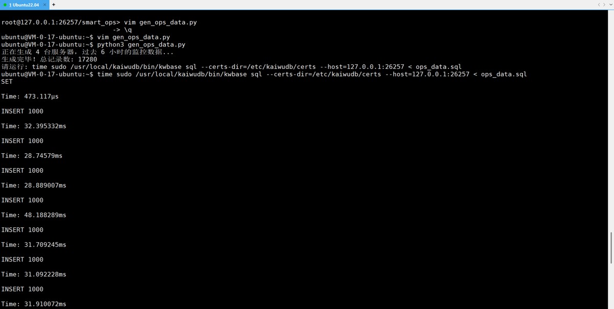 python3 gen_ops_data.py time sudo /usr/local/kaiwudb/bin/kwbase sql --certs-dir=/etc/kaiwudb/certs --host=127.0.0.1:26257 < ops_data.sql
