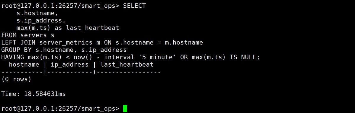 0 rows。 - 含义解读:这说明当前所有在册的服务器(cmdb 中登记的)在过去 5 分钟内都有正常的心跳上报,系统处于极其健康的状态。这种“反向查询”(找缺失的数据)是时序数据库中较难处理的场景,而 kwdb 凭借标准的 sql 能力(left join + having)轻松搞定。
