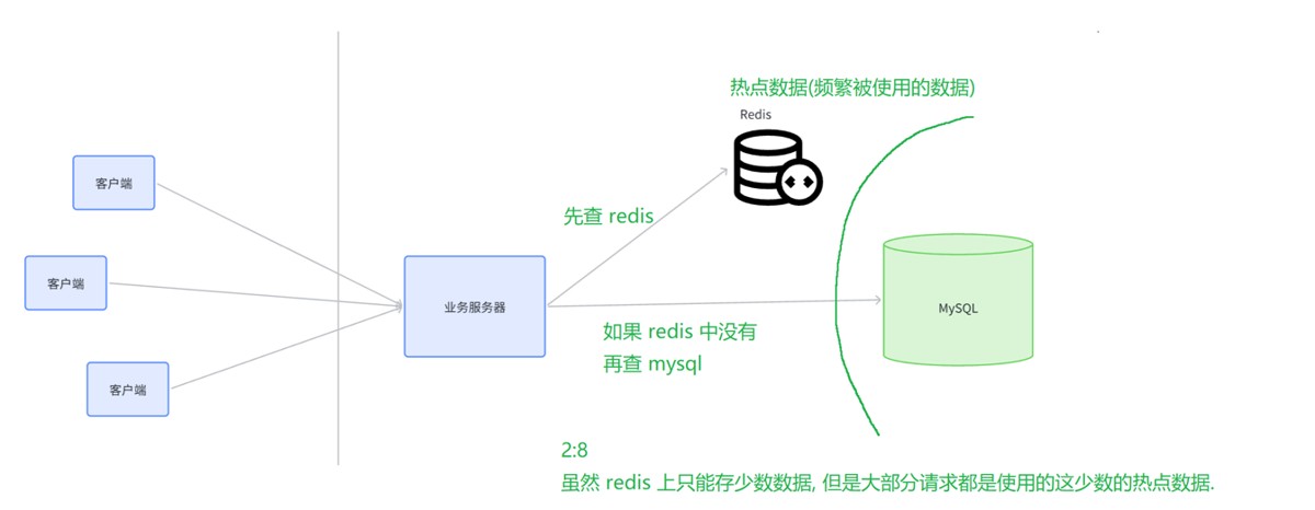 在高并发的场景下,直接使用传统的面向内存的数据库,资源开销会非常大,性能也非常低,数据库服务器很容易崩溃。因此可以把一些经常用到的数据(热数据:使用频率很高,但是占总数据量较少)统一放到redis中,当客户端查询时,先查询redis,查询不到,再去查询数据库。