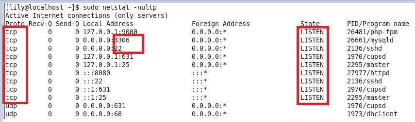 ~$ sudo netstat -nlpt active internet connections (only servers) proto recv-q send-q local address foreign address state pid/program name tcp 0 0 127.0.1.1:53 0.0.0.0:* listen 1144/dnsmasq tcp 0 0 127.0.0.1:631 0.0.0.0:* listen 661/cupsd tcp6 0 0 ::1:631 :::* listen 661/cupsd