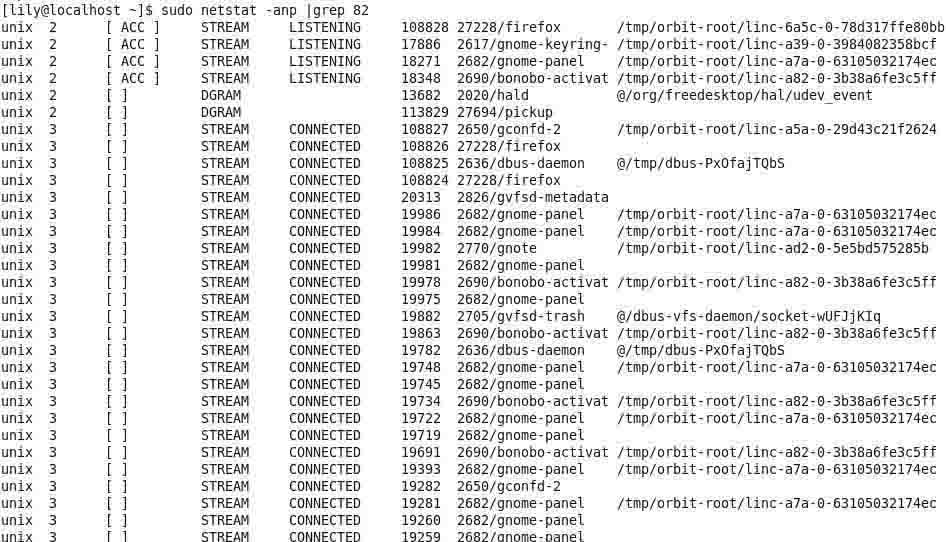 # netstat -lx active unix domain sockets (only servers) proto refcnt flags type state i-node path unix 2 [ acc ] stream listening 6294 private/maildrop unix 2 [ acc ] stream listening 6203 public/cleanup unix 2 [ acc ] stream listening 6302 private/ifmail unix 2 [ acc ] stream listening 6306 private/bsmtp