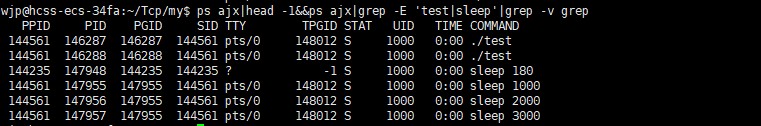 ps ajx|head -1&&ps ajx|grep -e 'test|sleep'|grep -v grep