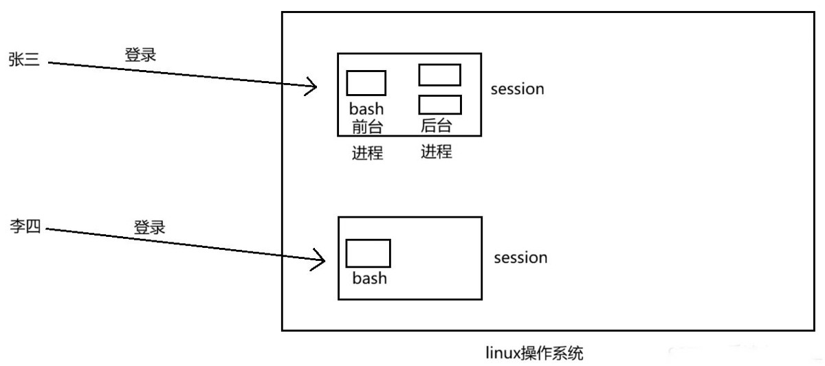 当张三登录 linux,李四也登录 linux,系统会给每个人单独开一个房间:张三的房间 = 张三的 session,李四的房间 = 李四的 sessio,这里的房间也就是一个会话,两个会话互不打扰,张三 退出,就会关闭这个会话,将这个会话的所有进程终止。