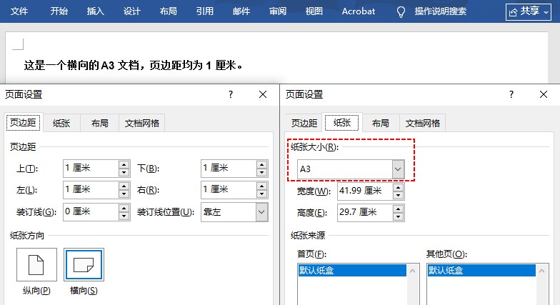 para.appendtext("这是一个横向的 a3 文档,页边距均为 1 厘米。");