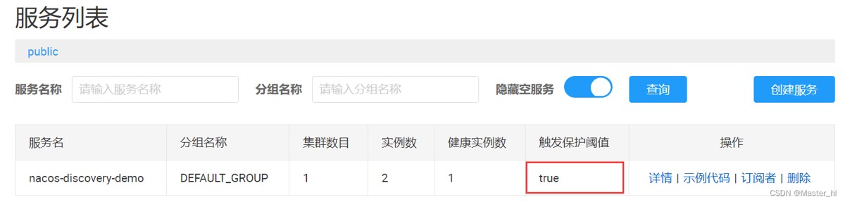6. 触发保护阈值:它是一个 0-1 之间的数,表示当健康实例数低于此阈值时,nacos会阻止所有服务实例的自动注销,以保护剩余的健康实例。(可以在服务详情里面的编辑服务中进行设置)