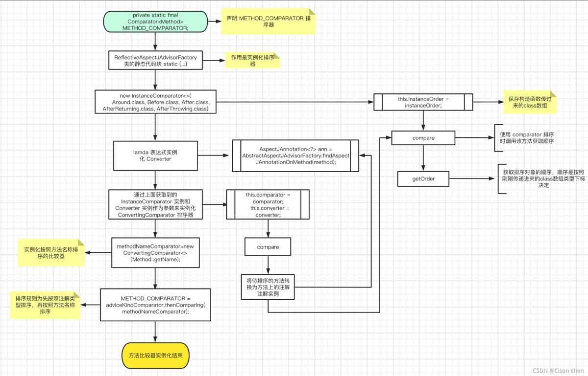 }其实上段获取排序的方法的逻辑很简单,就是通过反射获取到通知方法。此外,因为 @pointcut 只是切点,并不是一个增强方法,所以不需要生成 advisor, 所以这里就将它排除了。然后我们发现排序使用了 method_comparator, 所以具体怎么排序还是由该排序器决定的,接下来我们看一下它是如何实例化以及如何排序的。可以先看下面的流程图。