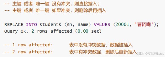 -- sn=20002已存在,删除原记录后插入新数据 replace into students (sn, name) values (20002, '孙伯符');