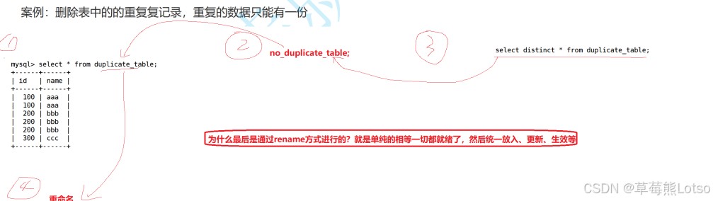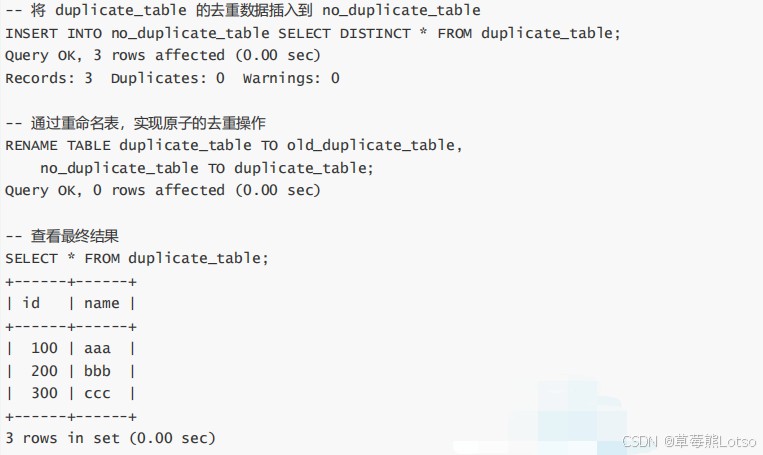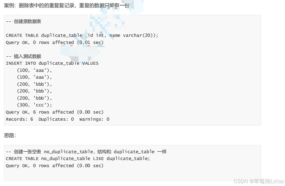 -- 创建空表(结构与students一致) create table students_copy like students; -- 将students的去重数据插入新表 insert into students_copy select distinct * from students;