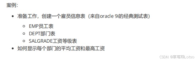 -- 准备雇员表(经典测试表) create table emp ( empno int primary key, ename varchar(20), job varchar(20), deptno int, sal float ); insert into emp values (7369, 'smith', 'clerk', 20, 800), (7499, 'allen', 'salesman', 30, 1600), (7521, 'ward', 'salesman', 30, 1250), (7566, 'jones', 'manager', 20, 2975), (7654, 'martin', 'salesman', 30, 1250), (7698, 'blake', 'manager', 30, 2850), (7782, 'clark', 'manager', 10, 2450), (7788, 'scott', 'analyst', 20, 3000); -- 1. 按部门分组,统计每个部门的平均工资和最高工资 select deptno, avg(sal) as 平均工资, max(sal) as 最高工资 from emp group by deptno; -- 2. 按部门和岗位分组,统计平均工资和最低工资 select deptno, job, avg(sal) as 平均工资, min(sal) as 最低工资 from emp group by deptno, job; -- 3. 筛选平均工资低于2000的部门(having筛选分组结果) select deptno, avg(sal) as 平均工资 from emp group by deptno having avg(sal) < 2000;