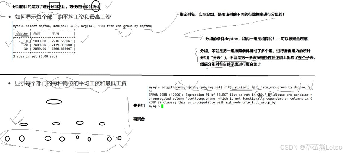 group by按指定列分组,having筛选分组结果(类似where,但作用于分组)。