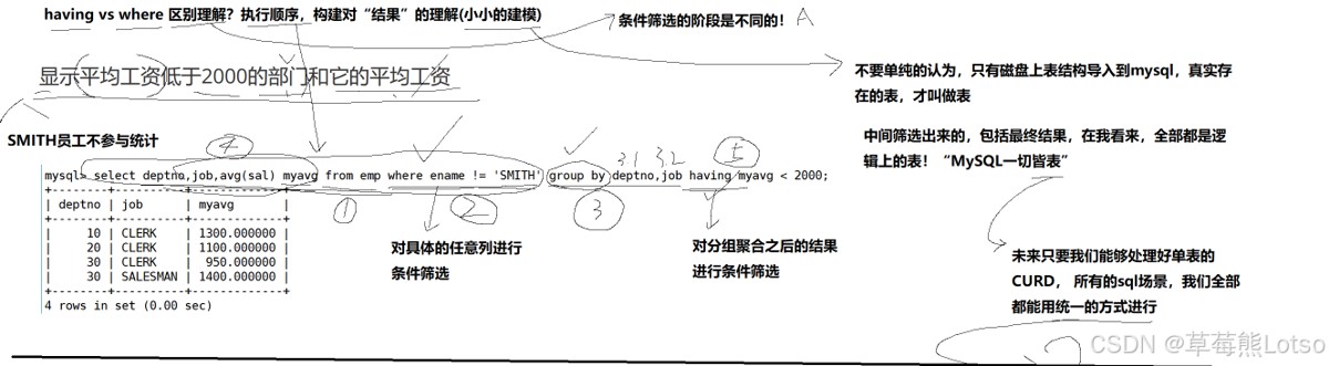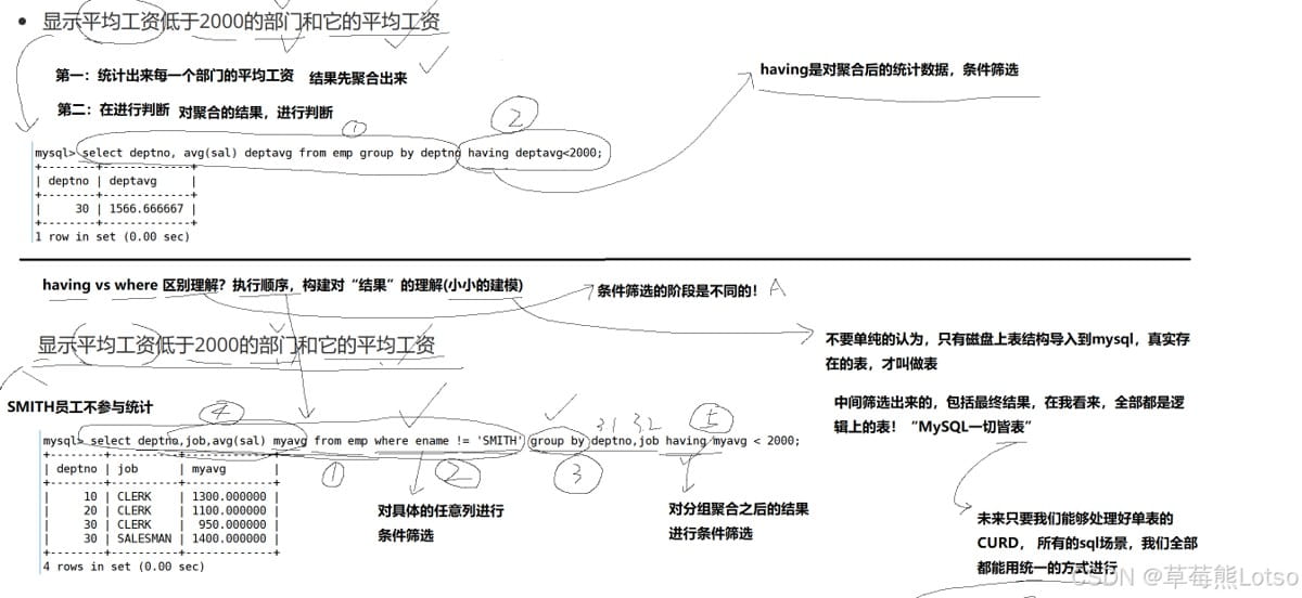 where中使用(select在where之后执行); having用于筛选分组结果(group by之后执行),where用于筛选行数据(group by之前执行)。