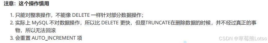 删除表中数据,支持条件删除、全表删除,还有高效的truncate截断表。