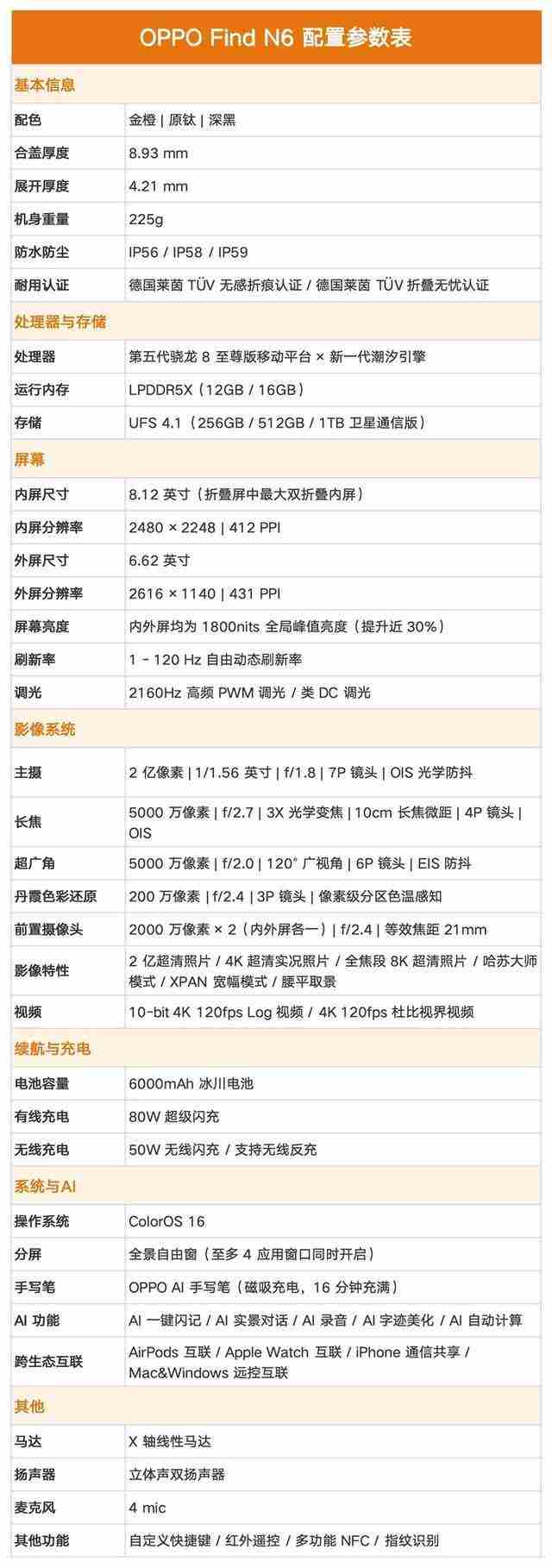 配色方面,oppo find n6提供了金橙、原钛、深黑三种选择。金橙色相当抢眼,活力满满的橙色搭配金色金属质感的边框,给人眼前一亮的感觉,辨识度极高。原钛色则是将钛合金那种沉稳可靠的气质凝练成了色彩,灰调中透出细腻光泽,适合偏好低调质感的商务用户。深黑色则是经典百搭之选,纯粹的黑色视觉一体性很强。