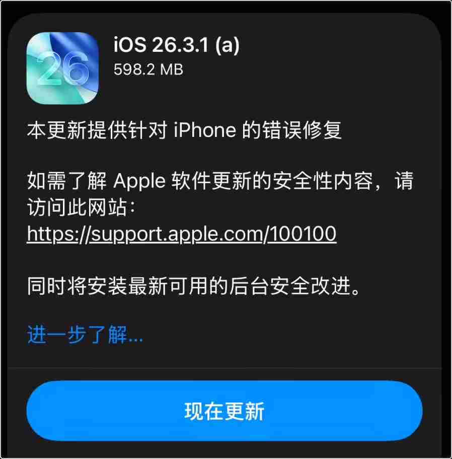 已经升级 ios 26.4 测试版的用户,是无法更新该版本的。如果你已升级 ios 26.3.1 正式版,需要进入“设置”-“隐私与安全性”-“后台安全改进”界面,检测并安装 ios 26.3.1 (a) 正式版。