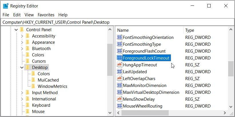 从那里,在右侧窗格中双击foregroundlocktimeout值。