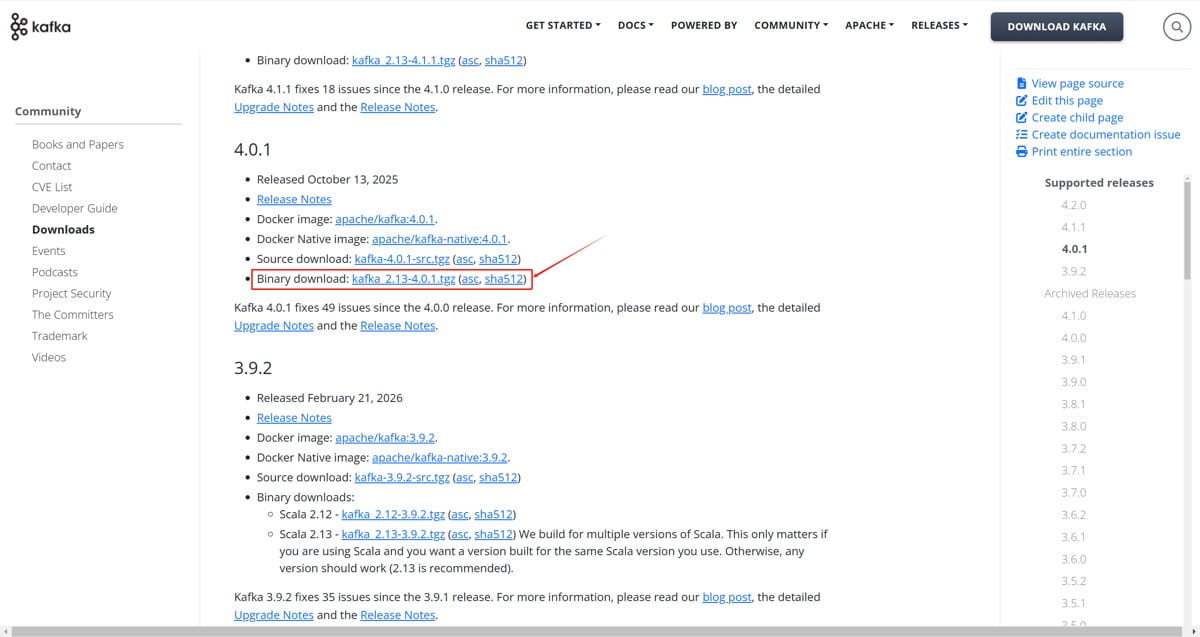 点击下载 kafka_2.13-4.0.1.tgz 到你的本地,或者直接在服务器上使用 wget 命令下载。
