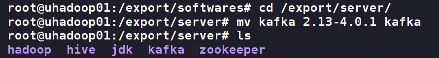 cd /export/server/ mv kafka_2.13-4.0.1/ kafka ls