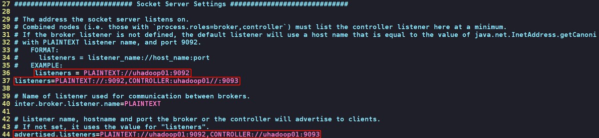 listeners=plaintext://uhadoop01:9092,controller://uhadoop01:9093 advertised.listeners=plaintext://uhadoop01:9092,controller://uhadoop01:9093
