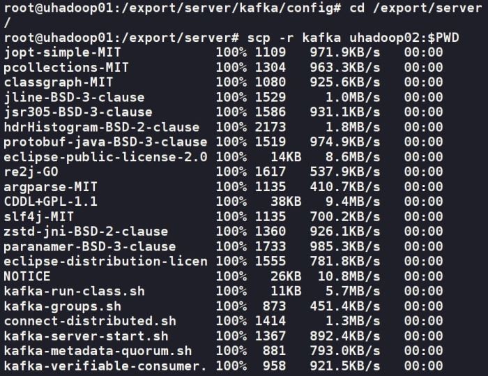 cd /export/server/ scp -r kafka uhadoop02:$pwd