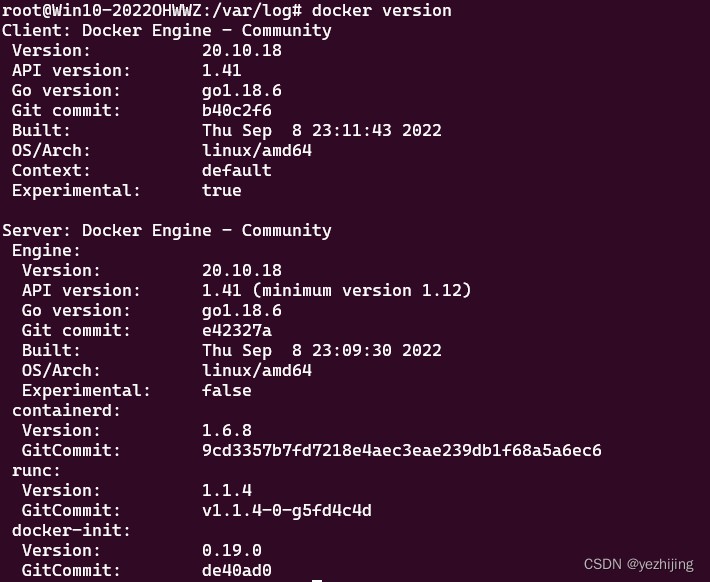 返回docker的版本信息及其依赖组件的版本信息则表示成功,
