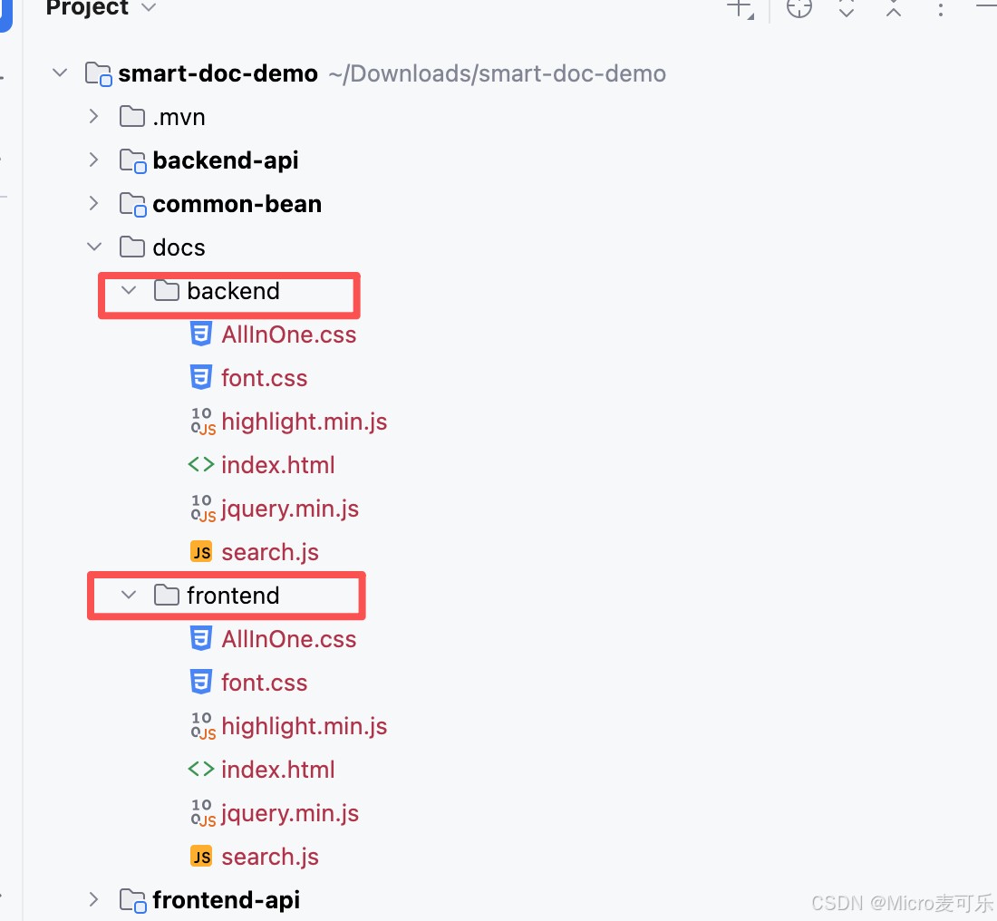 为了验证是否集中生成,我们将前后端api的配置文件 smart-doc.json 中生成文档目录分别修改为: