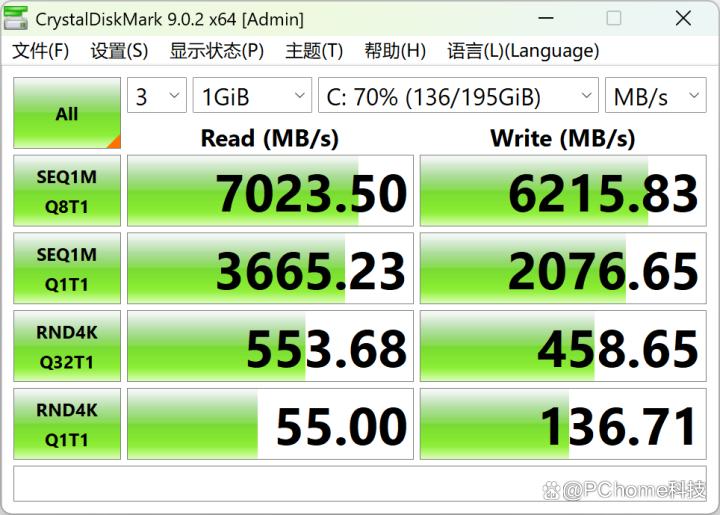 硬盘方面,xiaomi book pro 14搭载了来自长江存储的1tb nvme ssd,采用pcie 4.0 x4通道。在crystaldiskmark的基准测试中,顺序读取速度高达7023.50 mb/s、顺序写入速度6215.83 mb/s,4k随机读取达到55.00 mb/s,写入136.71 mb/s,处于pcie 4.0固态硬盘中的前列水平。