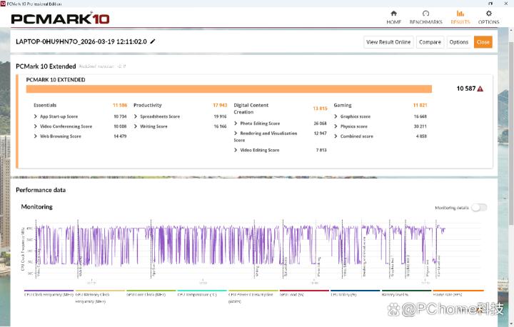 整机性能方面,在pcmark10 extended的场景测试中,得分为10587,基本功能、生产力、数字内容、甚至游戏子项得分也全部超过1万,作为一款轻薄笔记本,这样的性能已经超越传统专业笔记本。