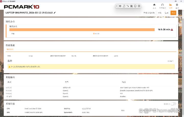 再来看电池续航,xiaomi book pro 14内置72wh锂聚合物电池。在pcmark 10的现代办公电池续航测试中(电池性能方案为平衡,系统版本windows 11 x64 25h2,屏幕亮度40%),最终成绩为16h38min,续航能力还是十分强悍的。