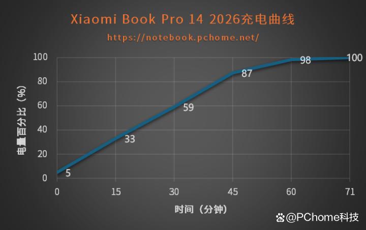 充电方面,xiaomi book pro 14标配100w双头usb type-c充电器。充电实测显示,前30分钟即可充至近60%的电量,45分钟充到87%,完全充满仅耗时71分钟。综合来看,xiaomi book pro 14的续航能力还是很优异的,撑得久、充得快,续航焦虑可以抛弃了。