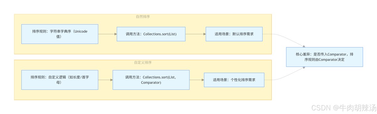 如果你需要根据特定的规则(例如按字符串长度或自定义的字符顺序)进行排序,可以提供一个comparator给collections.sort()方法。例如,如果你想按字符串长度排序,可以这样做: