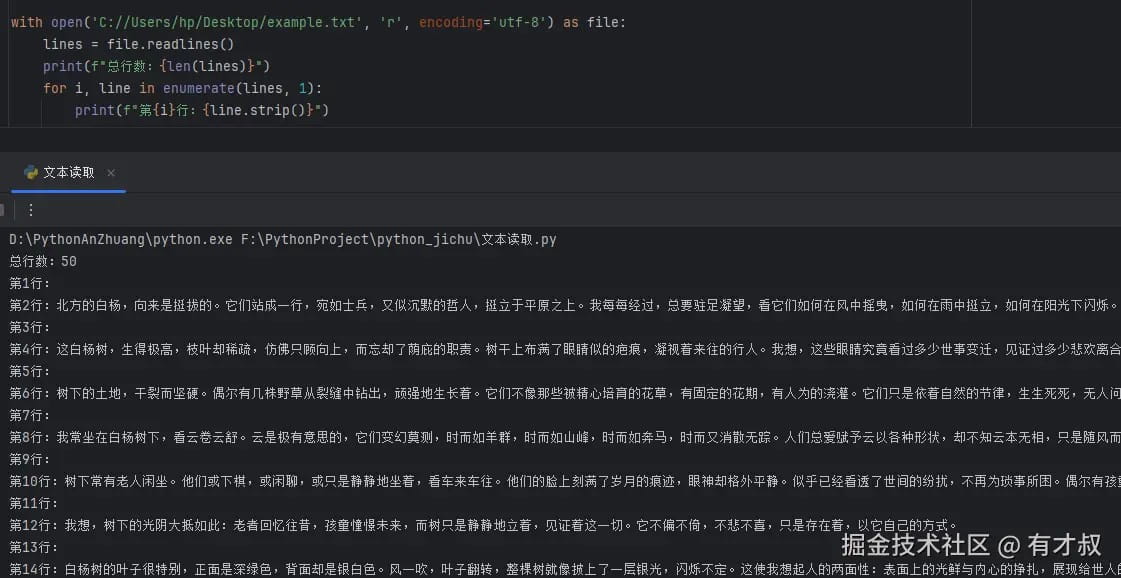 | readlines() | 列表 | 高 | 中小文件,需要行级操作 | 返回行列表,方便按行访问 |