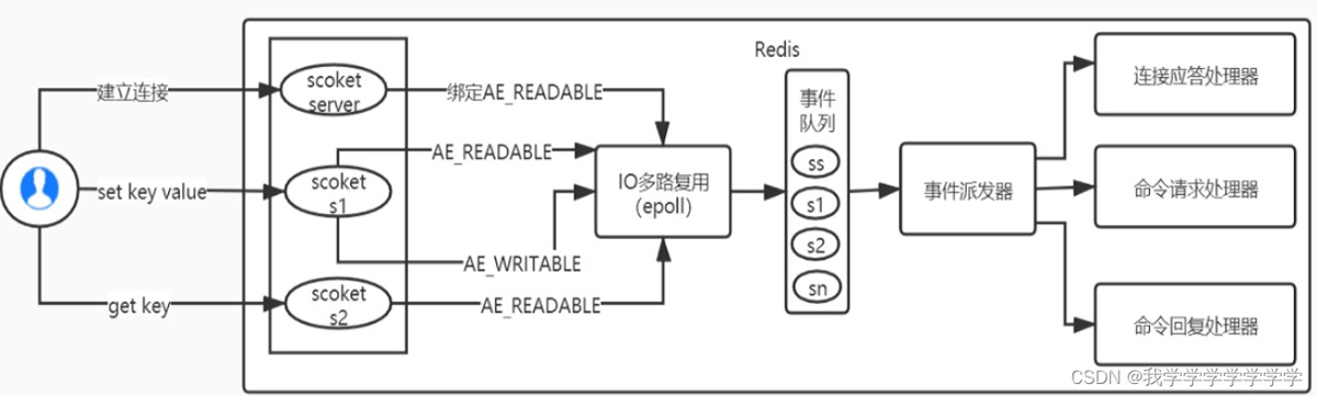这是因为redis使用了io多路复用,redis利用epoll来实现io多路复用,将连接信息和事件放到队列中,一次放到文件事件分派器,事件分派器将事件分发给事件处理器。