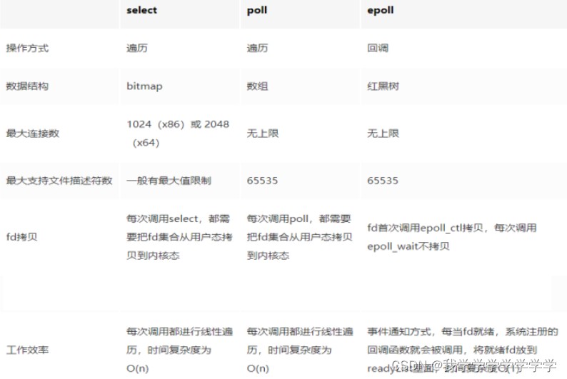 4、select并没有通知用户态哪一个socket有数据,仍然需要o(n)的遍历。select 仅仅返回可读文件描述符的个数,具体哪个可读还是要用户自己遍历。(可优化为只返回给用户就绪的文件描述符,无需用户做无效的遍历)。