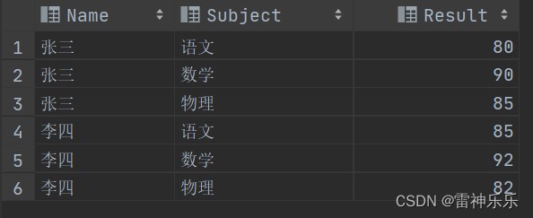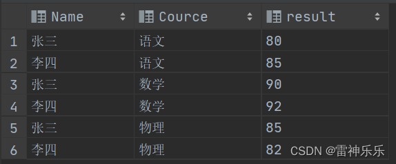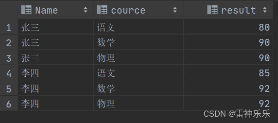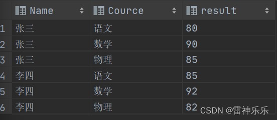 select name,'语文' cource,语文 result from cj2 union all select name,'数学' cource,数学 result from cj2 union all select name,'物理' cource,物理 result from cj2; # 查询后按照结果排序 select * from (select name,'语文' cource,语文 result from cj2 union all select name,'数学' cource,数学 result from cj2 union all select name,'物理' cource,物理 result from cj2) t order by t.name;