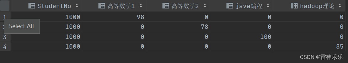 select studentno, max(高等数学1) math1, max(高等数学2) math2, max(java编程) java, max(hadoop理论) hadoop
