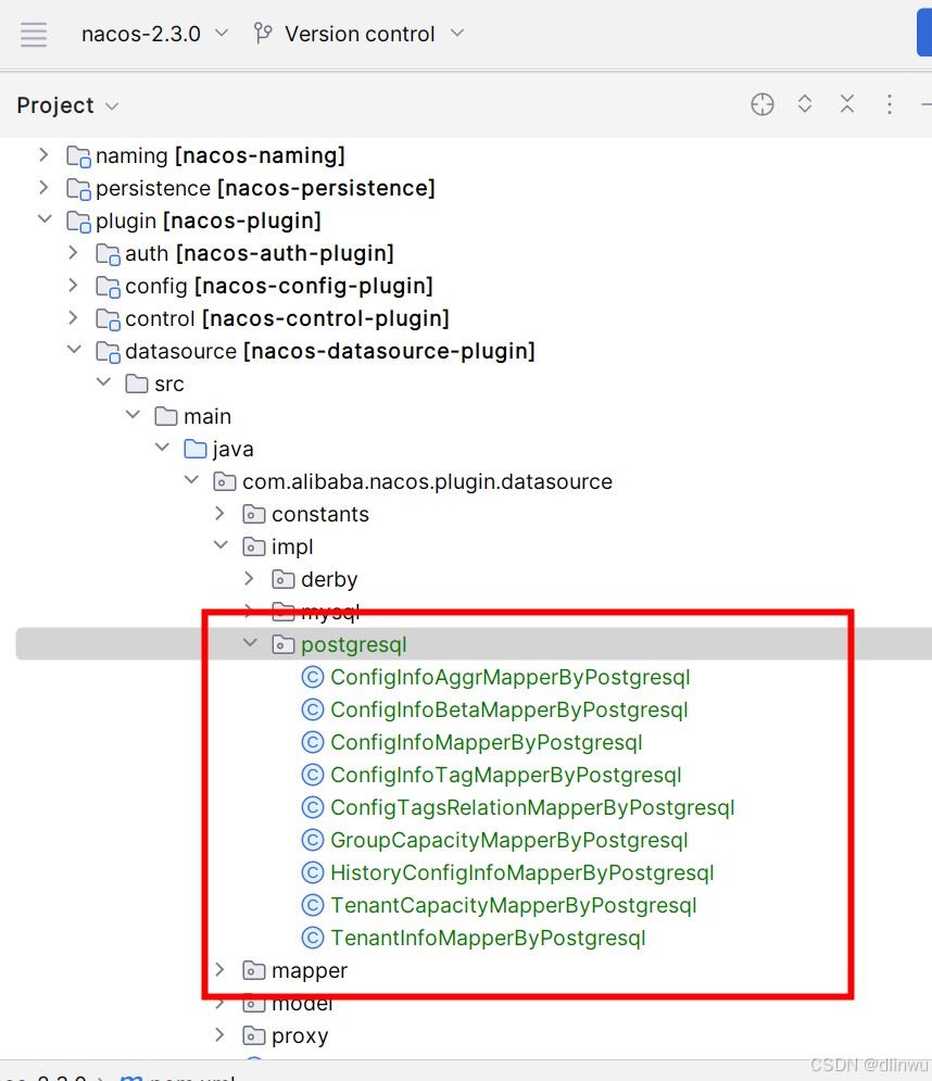 3、在项目的nacos-plugin模块的nacos-datasource-plugin模块com.alibaba.nacos.plugin.datasource.impl包下新建一个包,名为postgresql,拷贝同级包mysql下的所有文件到postgresql包下,修改类名和文件名为xxxbypostgresql,如图: