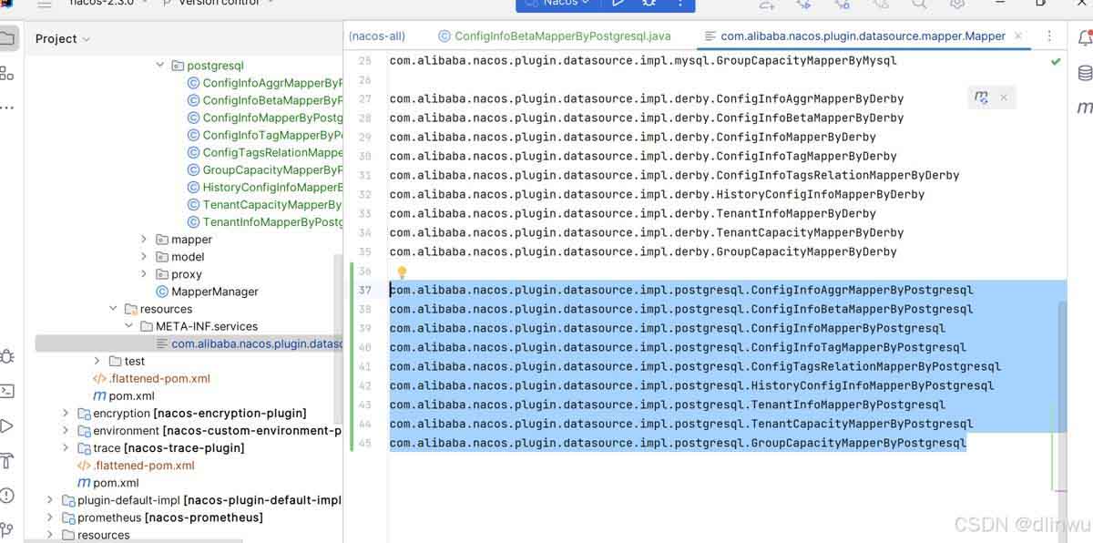5、在改项目resource目录下,找到com.alibaba.nacos.plugin.datasource.mapper.mapper文件,在后面追加: