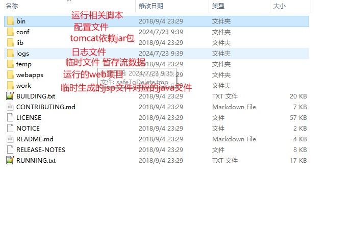 - work:运行时生成的文件,最终运行的文件都在这里。通过webapps中的项目生成的!可以把这个目录下的内容删除,再次运行时会生再次生成work目录。当客户端用户访问一个jsp文件时,tomcat会通过jsp生成java文件,然后再编译java文件生成class文件,生成的java和class文件都会存放到这个目录下。