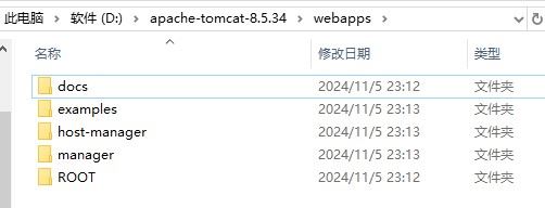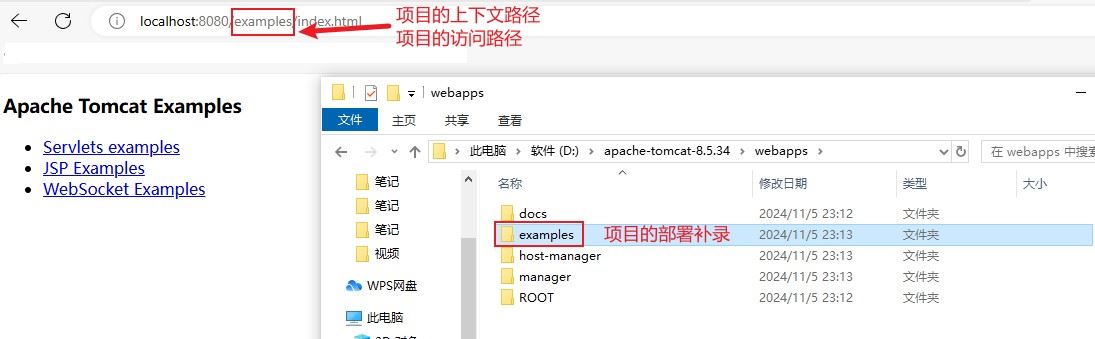 - webapps:存放web项目的目录,其中每个文件夹都是一个项目;如果这个目录下已经存在了目录,那么都是tomcat自带的项目。其中root是一个特殊的项目,在地址栏中访问:http://127.0.0.1:8080,没有给出项目目录时,对应的就是root项目。http://localhost:8080/examples,进入示例项目。其中examples"就是项目名,即文件夹的名字。