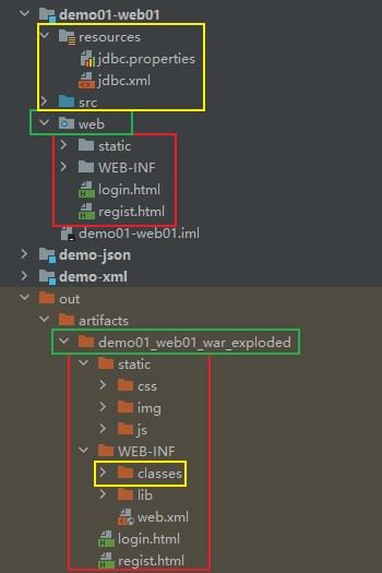 - static和web-inf对应demo01_web01_war_exploded下的static和web-inf;