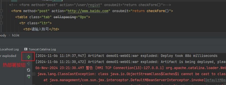 当想要修改代码时,不需要重启tomcat服务,点击热部署按钮即可。