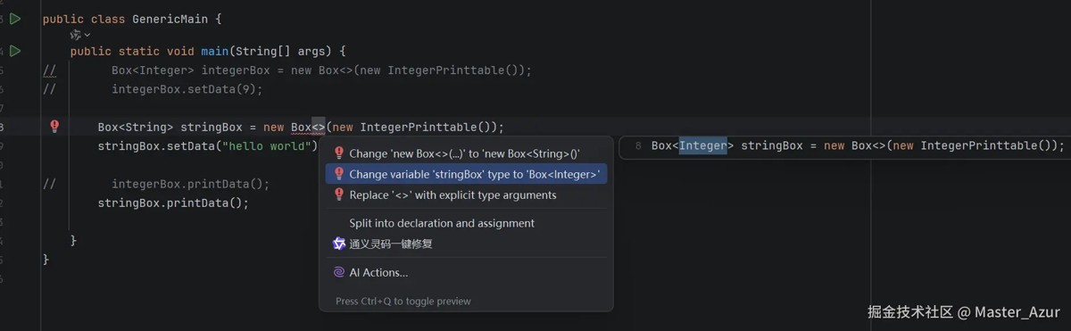 }- 我们在genericmain类中使用box类,我们先指定box的类型,在创建box的对象,如下方代码所示: