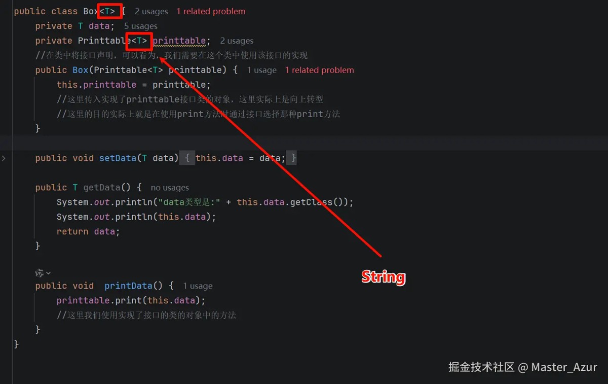 public class box<t>{ private t data; private printtable<t> printtable; //在类中将接口声明,可以看为,我们需要在这个类中使用该接口的实现 public box(printtable<t> printtable) { this.printtable = printtable; //这里传入实现了printtable接口类的对象,这里实际上是向上转型 //这里的目的实际上就是在使用print方法时通过接口选择那种print方法 } public void setdata(t data) { this.data = data; } public t getdata() { system.out.println("data类型是:" + this.data.getclass()); system.out.println(this.data); return data; } public void printdata() { printtable.print(this.data); //这里我们使用实现了接口的类的对象中的方法 } } - 为了使用接口,可以先创建一个接口的引用