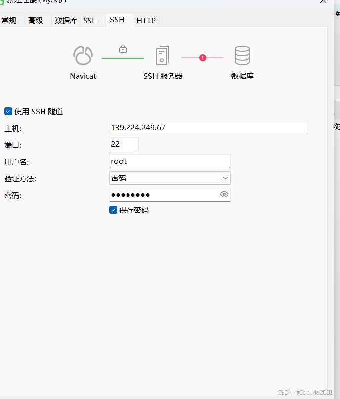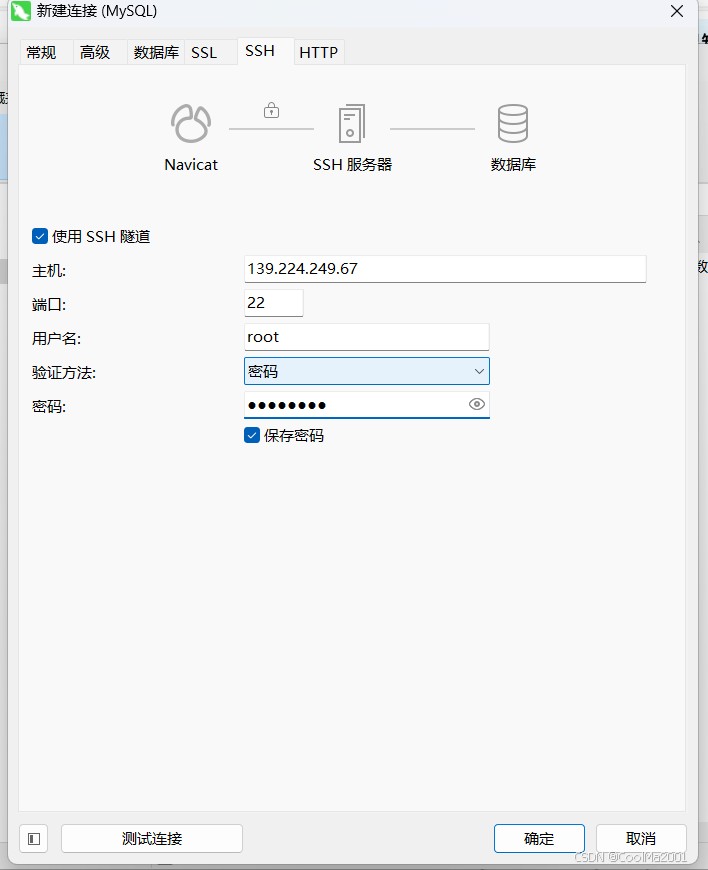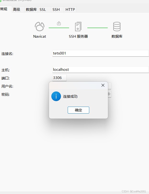 切记这里的主机,是你远程服务器的ip地址,用户名是你远程服务器上的用户名,密码是服务器密码,这个地方的所有东西都和mysql无关。点击测试连接,不要点确定,接下来你机会看到这个